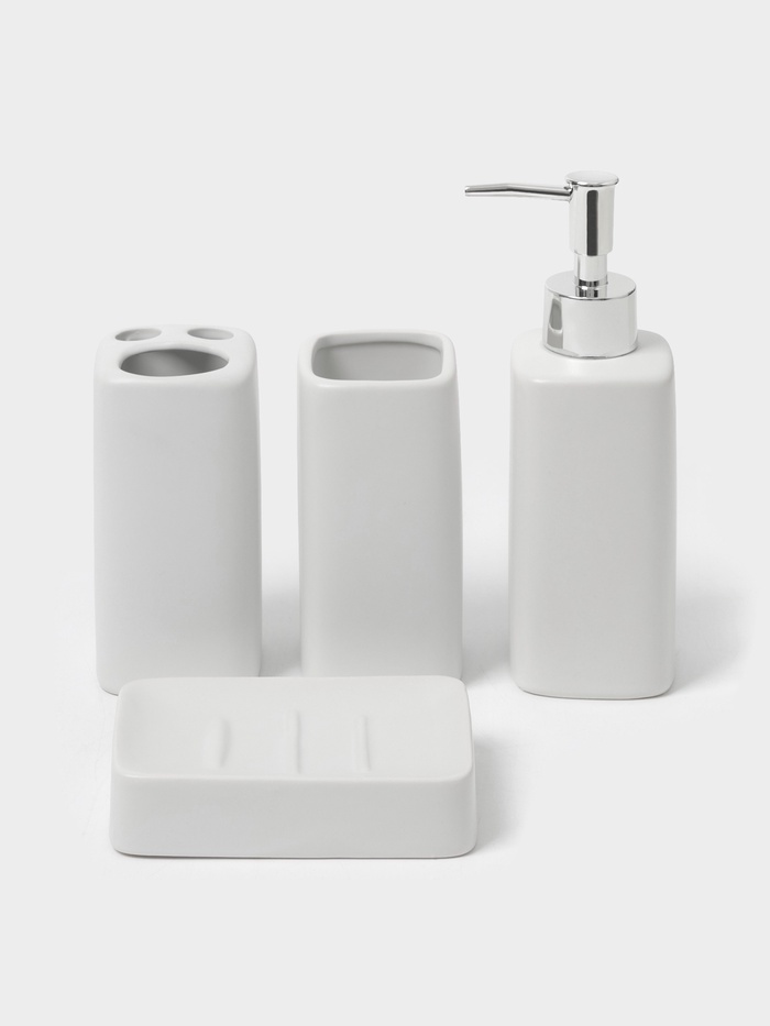 Набор аксессуаров организует пространство и станет стильным украшением Вашей ванной комнаты. За счет сдержанного дизайна данный керамический набор в ванную подойдет к любому дизайну ванной комнаты. Набор состоит из 4 предметов: 2 стакана, мыльница, дозатор.