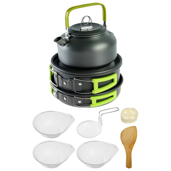 Набор походной посуды из анодированного алюминия позволяет соединить в себе приготовление еды и напитков. Имеет откидные переносные ручки с термоизолирующим покрытием, которые экономят объем при транспортировке, делая использование посуды более комфортным.