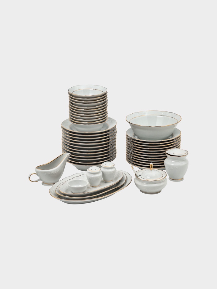 Столовый сервиз на 12 персон объединяет 48 предметов из белого фарфора с деликатным рельефом. Полный набор посуды рассчитан на сервировку завтраков, обедов и ужинов для большой семьи или приёма гостей. Единый дизайн всех предметов создаёт аккуратную и цельную картину на столе.