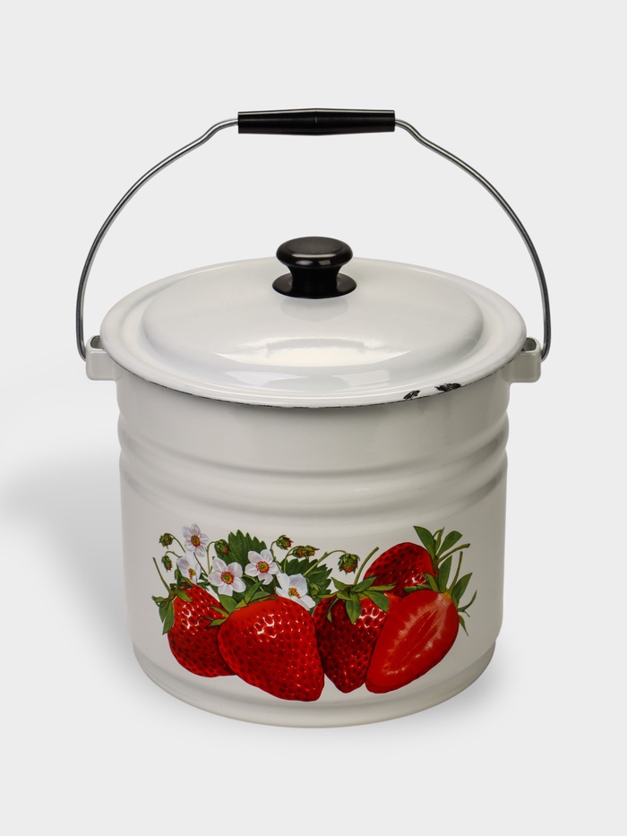 - Удобство в использовании: ручка обеспечивает комфортный хват даже при полной загрузке. Крышка защищает содержимое от пыли и посторонних запахов — идеально для хранения воды, молока, рассола или урожая с огорода.